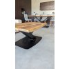 K našemu designovému jídelnímu stolu CROSS Vám nyní nově nabízíme jedinečnou možnost dokoupit také jeho zmenšenou verzi. Jedná se o elegantní konferenční stolek, který byl navržen jako jeho pomyslný „malý bratříček“. Tento elegantní konferenční stolek, jehož rozměry se pohybují kolem 1250x650x450 mm, skvěle doplní váš interiér. Konferenční stolek pro vás vyrobíme ze stejné fošny, jako stolovou desku vašeho jídelního stolu a tento fakt zajistí to, že oba stoly budou mít stejný odstín i stejnou strukturu povrchu dřeva.
