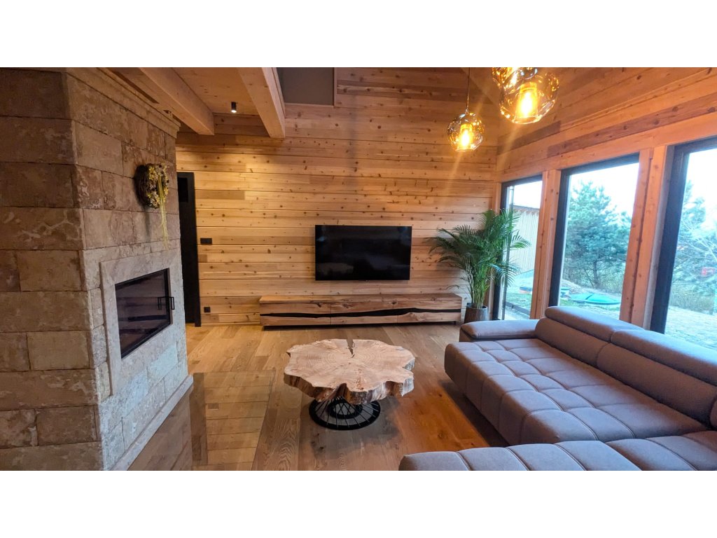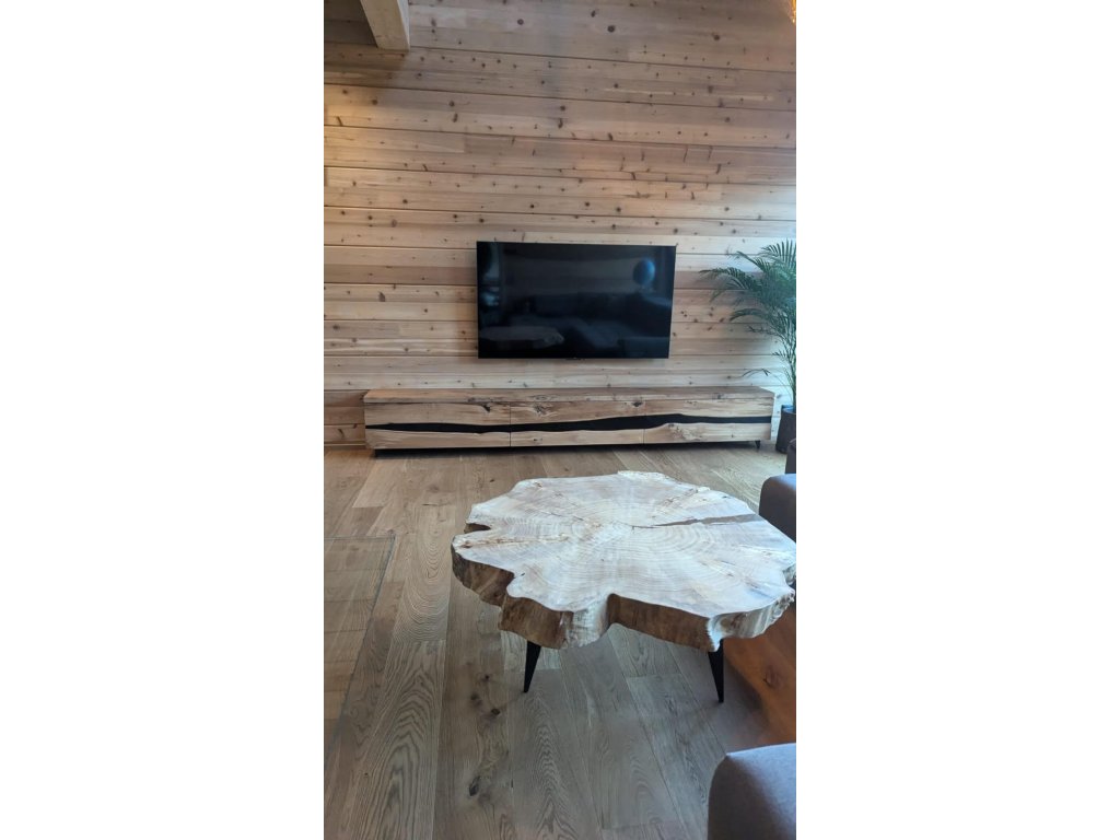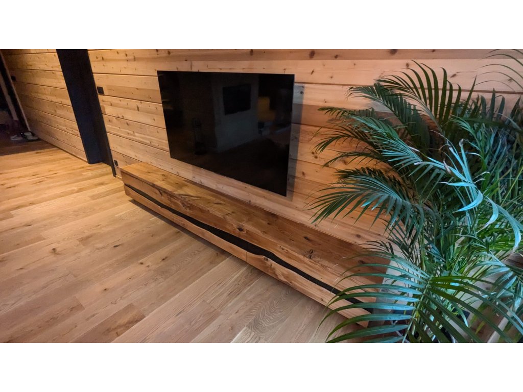 TV komoda River z dubového masivu je navržena jako stabilní, podlahově stojící kus nábytku, který působí pevně, přirozeně a zároveň designově výrazně. Charakter komody definuje kombinace masivního dřeva s dominantním prvkem kouřového kaleného skla, které v plynulé, organické linii protíná čelo komody a vytváří efekt připomínající tok řeky.