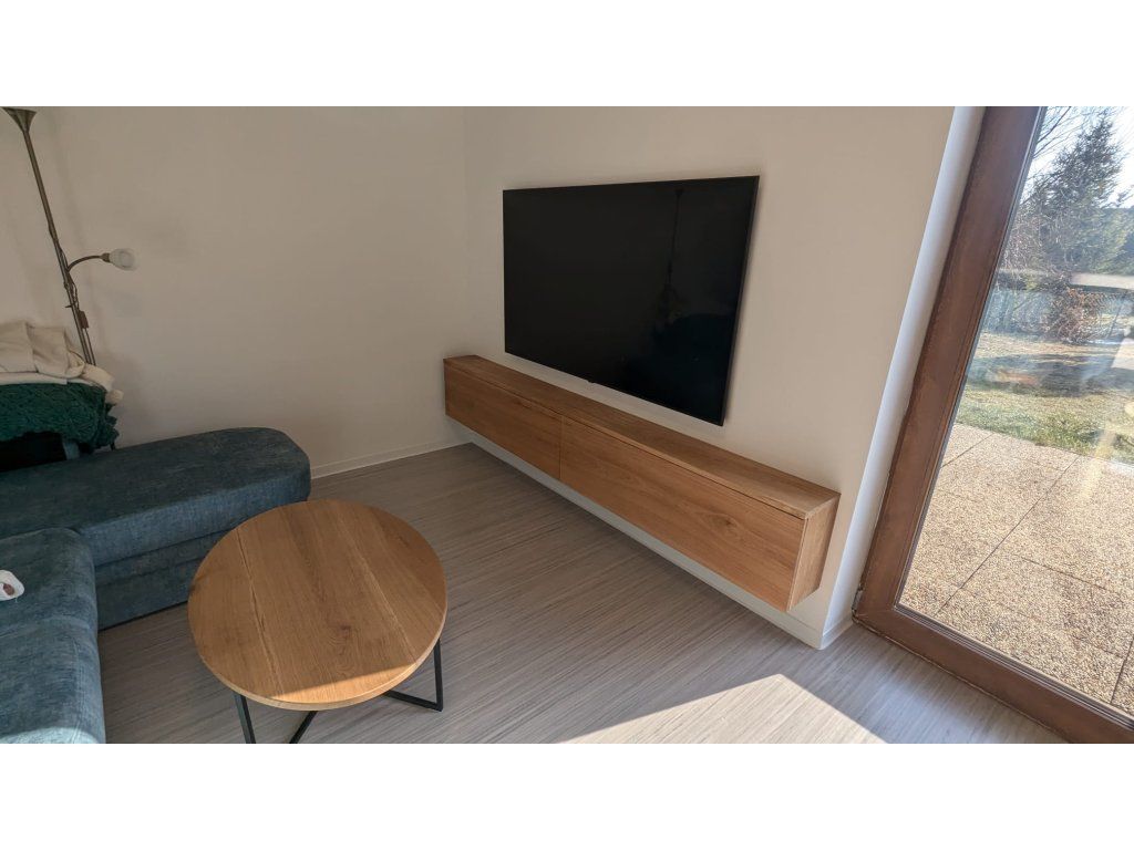 TV stolek může být řešen jako stojící na subtilních kovových nohách nebo jako závěsný model. Finální provedení závisí na vašich preferencích a dispozicích prostoru.