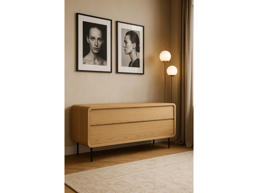 TV stolek zaujme plynulými rádiusy a měkce tvarovanými hranami, které dodávají nábytku kultivovaný a současný vzhled. Kombinace masivního korpusu a subtilních kovových nohou vytváří vizuální lehkost, díky níž působí stolek elegantně i v menším prostoru. Vyvážené proporce z něj činí designový solitér, který přirozeně doplní obývací zónu.