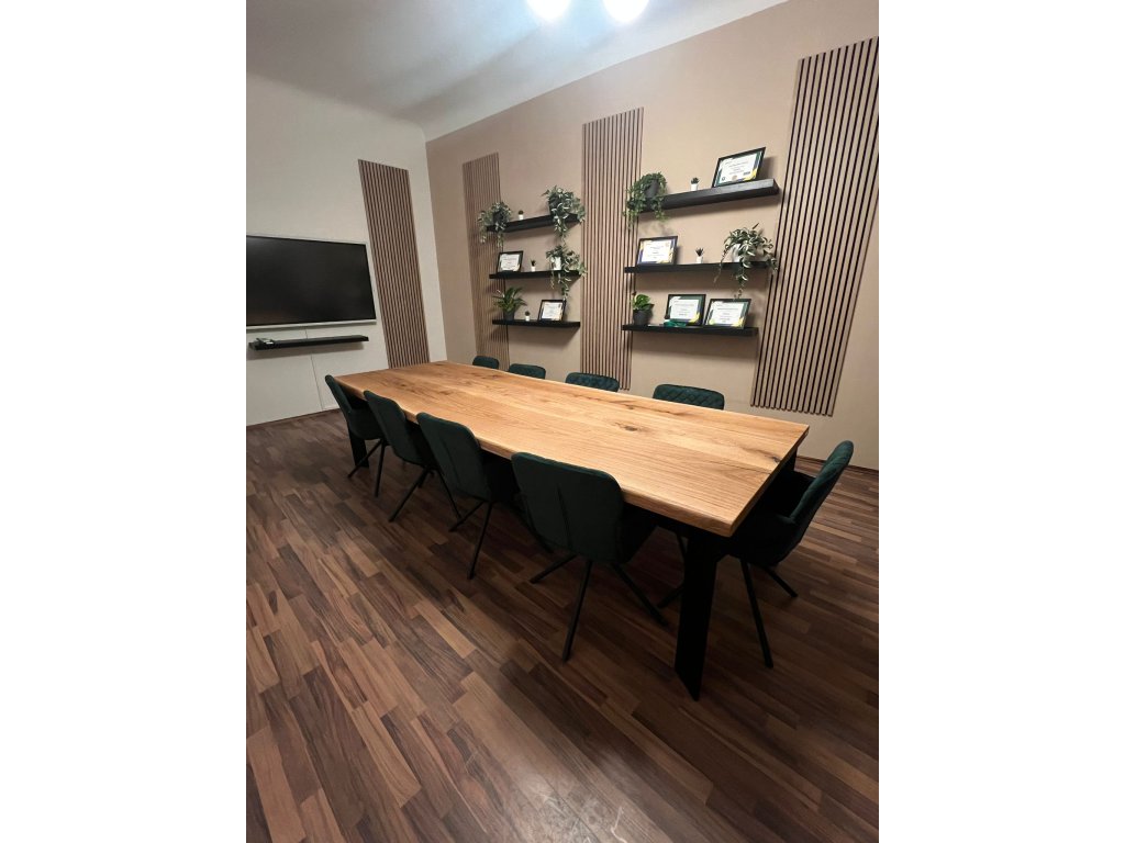 Na míru vyrobený zasedací stůl z masivního dubu posouvá firemní prostředí na zcela novou úroveň. Využíváme rozsáhlé zásoby kvalitního řeziva, díky nimž dokážeme vytvořit i mimořádně dlouhou stolovou desku z jednoho kusu dřeva — ideální pro prostorné kanceláře a zasedací místnosti, kde je důraz na estetiku stejně důležitý jako funkčnost. Designová kovová podnož dodává konstrukci stabilitu a vizuální lehkost.